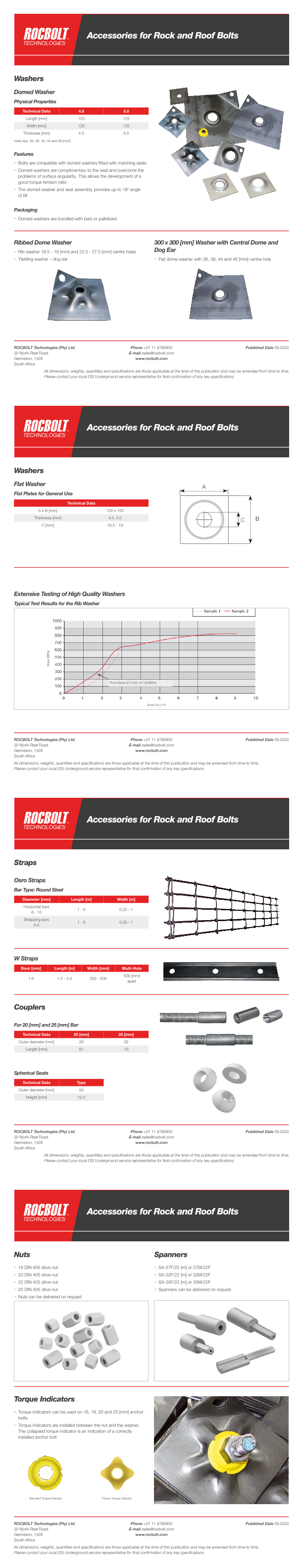 Comprehensive datasheet for Rocbolt rock and roof bolt accessories, including domed, ribbed, and flat washers, Osro and W straps, couplers, spherical seats, DIN 405 nuts, and torque indicators. All components are tested for high yield strength and designed to accommodate angular surfaces up to 18°, ensuring reliable tension and stability in underground mining support systems.
