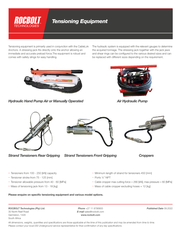 Robust hydraulic kit for pre-loading CableLok anchors, comprising stressing jack with interchangeable jaws and shear rings, air or hand pump, rear- or front-gripping strand tensioners (100–250 kN, 75–125 mm stroke), and a 290 kN cable cropper. Gauged system delivers accurate tonnage, safety slings ease handling; consult DSI for model-specific configurations