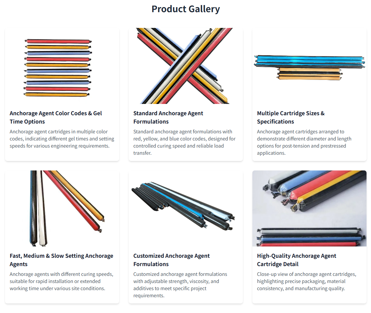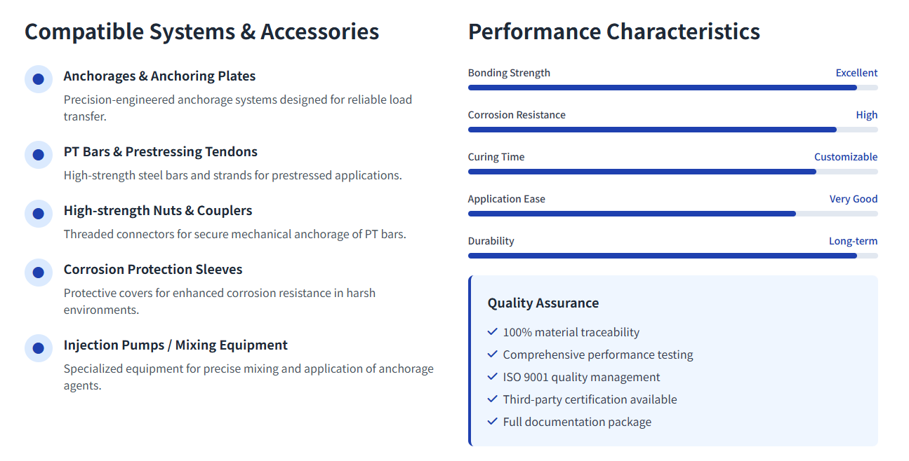| Key Applications Post-tensioned concrete structures Bridge construction and rehabilitation Geotechnical slope stabilization Tunnel and underground construction Industrial plant foundations | Product Range Fast-curing formulations (CKA, CKB) Standard setting times (K, Z, M) Various diameters and lengths Custom packaging options Complete anchorage systems |