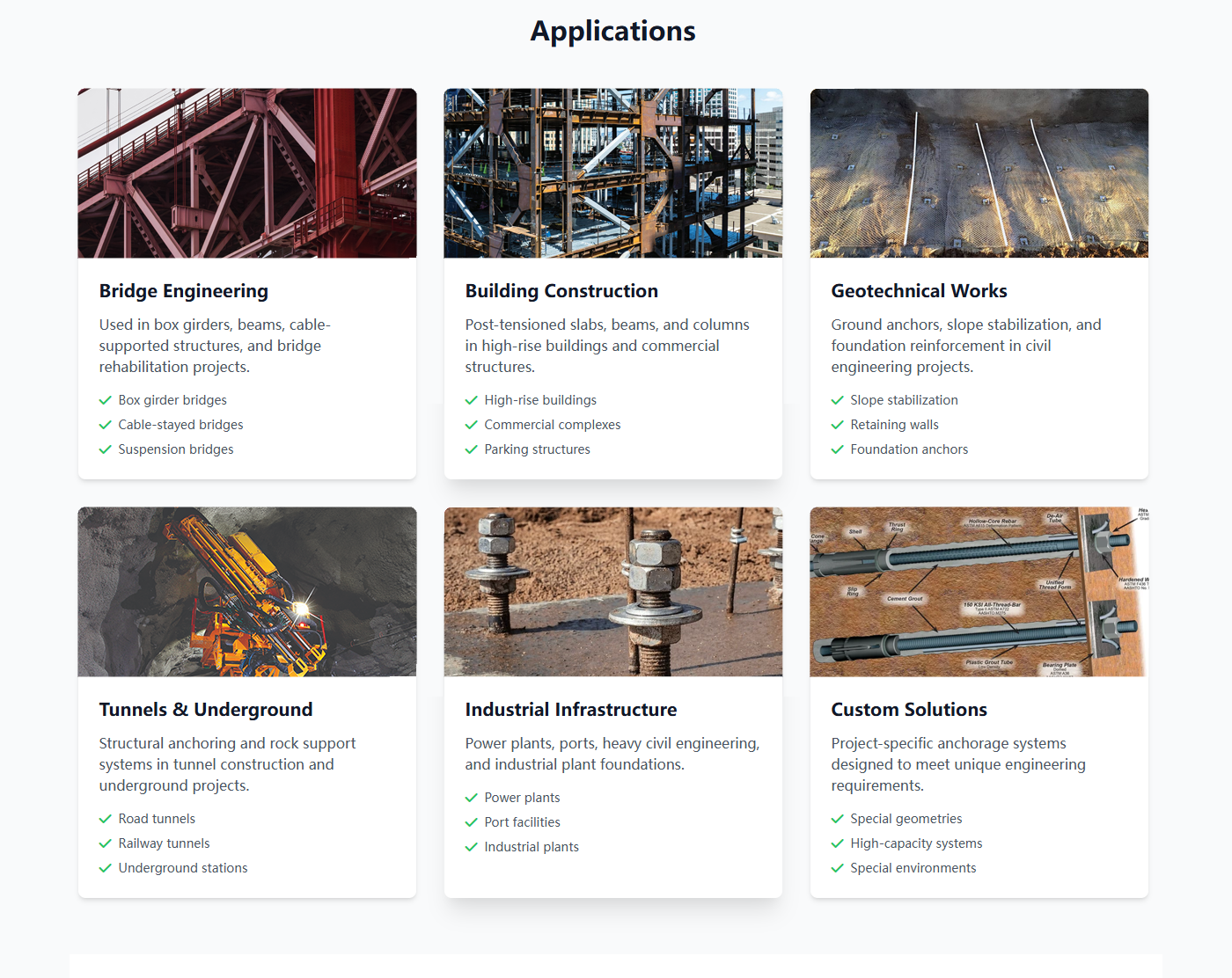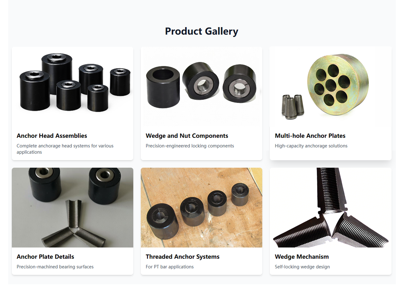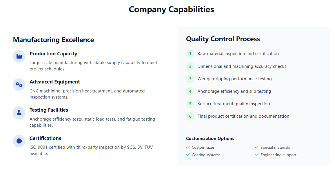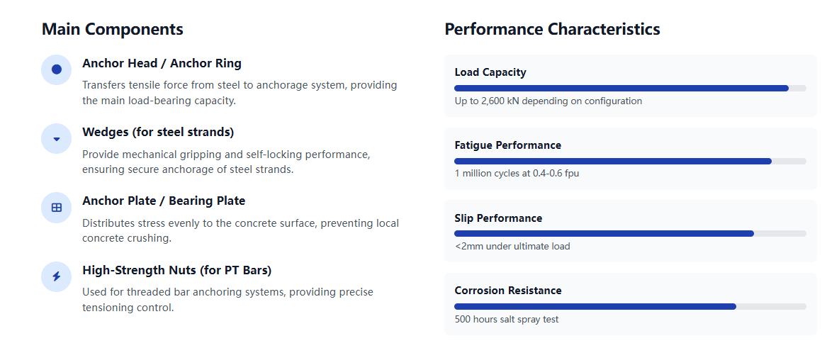 | Key Applications: •Bridge construction and rehabilitation •High-rise building structures •Geotechnical slope stabilization •Tunnel and underground construction •Industrial plant foundations | Product Range Single-hole anchorages Multi-hole anchorages (2-31 holes) Wedge-type anchorages Threaded anchorages for PT bars Custom-designed solutions |