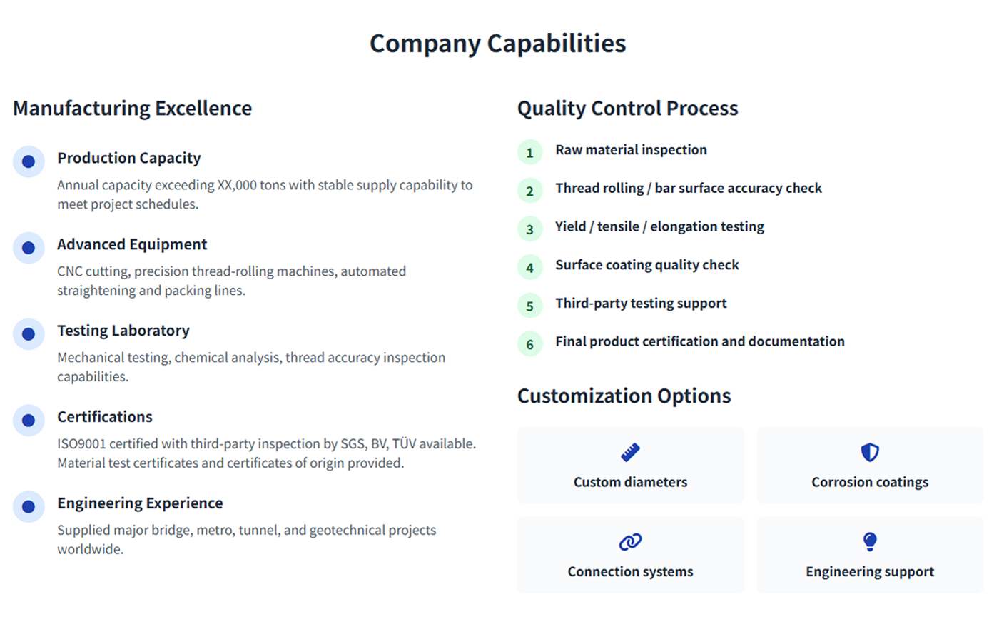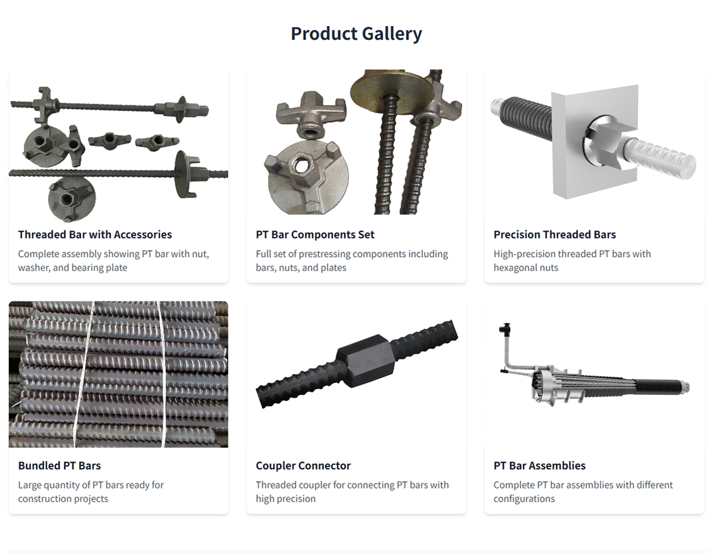 | Key Applications Post-tensioned concrete structures Bridge construction and rehabilitation Geotechnical slope stabilization Tunnel and underground construction Industrial plant foundations | Product Range High-strength PT bars (1860-2000 MPa) Diameters from 12mm to 40mm Smooth, threaded, or epoxy-coated surfaces Custom lengths and configurations Complete anchorage systems |