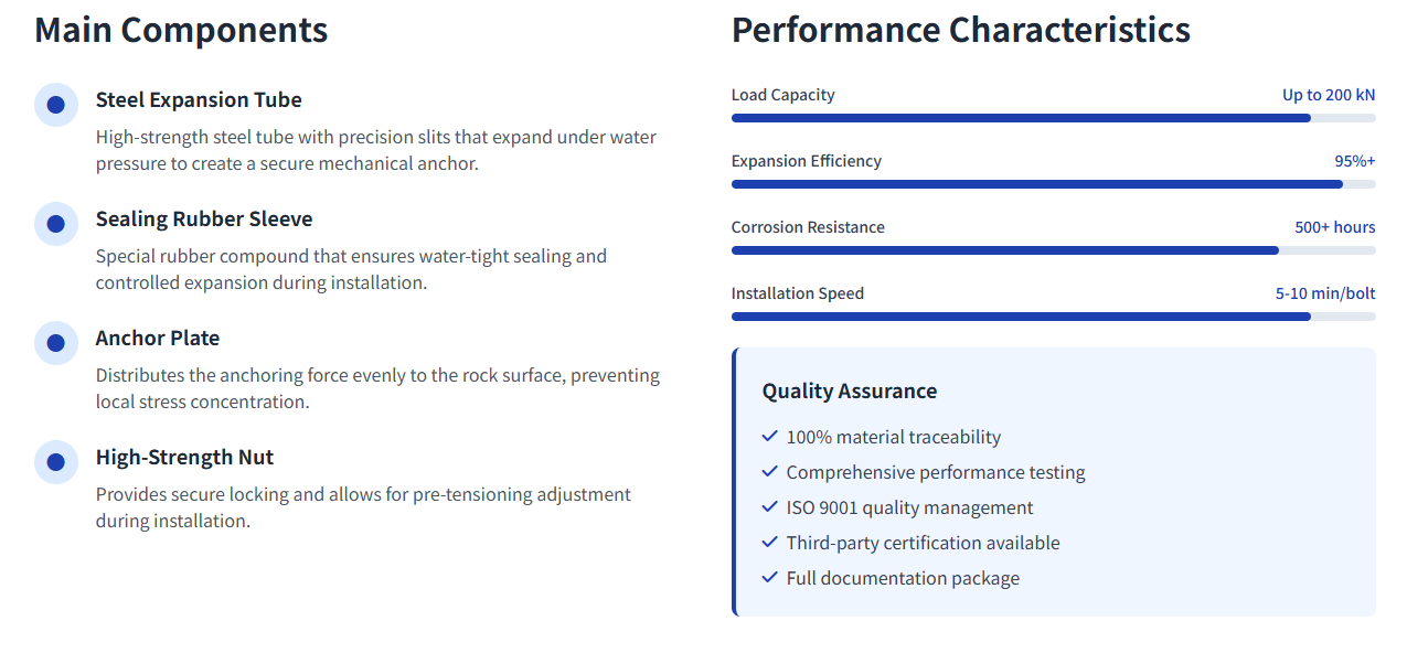 | Immediate Load-Bearing Expands under water pressure to provide instant rock anchorage, ensuring immediate stability in critical applications. | High Strength & Durability Withstands cyclic and static loads in underground environments, providing long-term structural integrity. | Corrosion-Resistant Suitable for wet, aggressive, or corrosive rock conditions, maintaining performance in challenging environments. |
