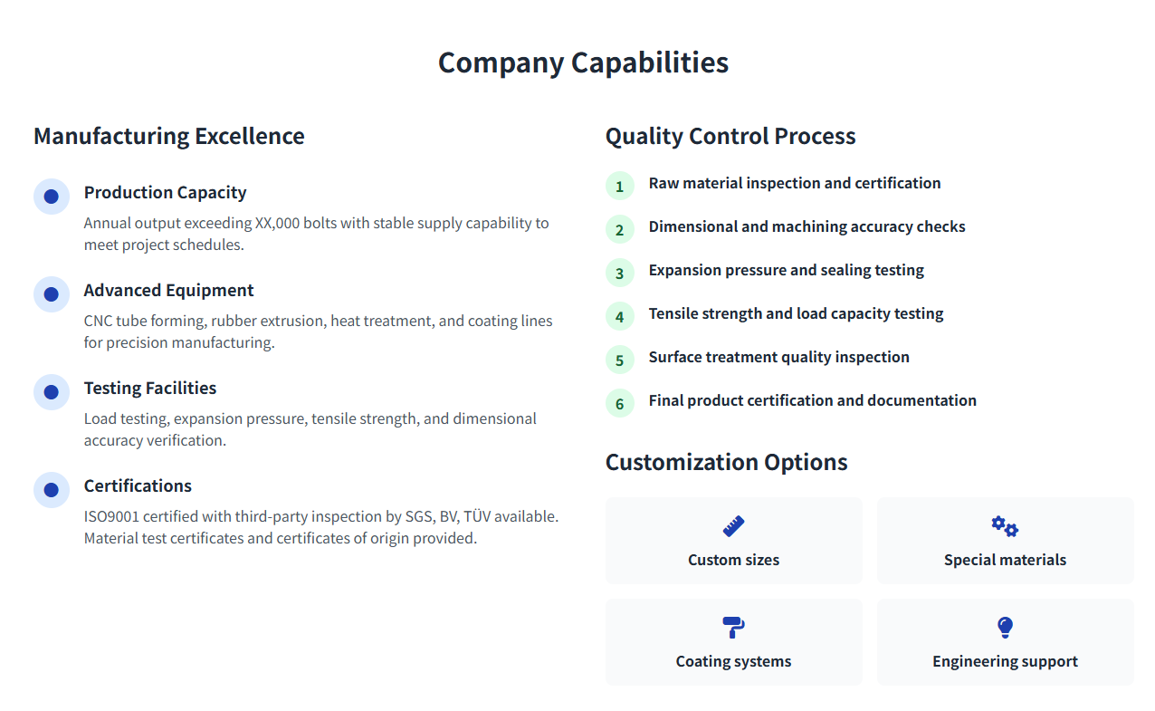 | Accessories | Washers, nuts, end caps | Optional, complete anchoring system |