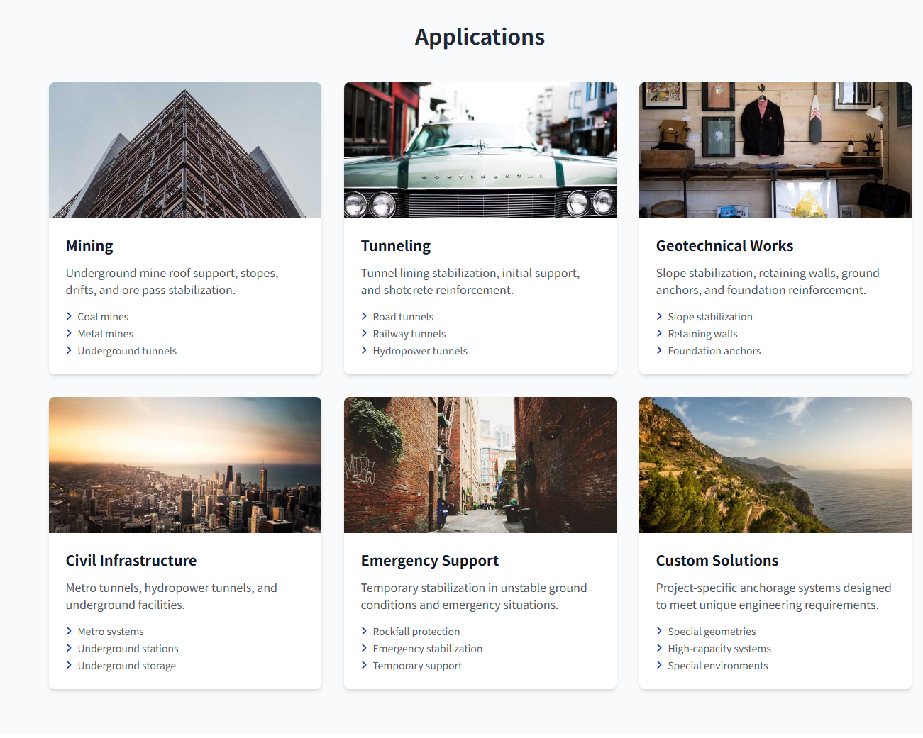 | Key Applications Underground mining roof support Tunnel lining stabilization Slope stabilization projects Ground anchor reinforcement Underground facility construction | Product Range Standard diameter bolts (22-32 mm) Custom length bolts (1-6 m) Corrosion-resistant coated bolts Complete anchorage systems Project-specific solutions |